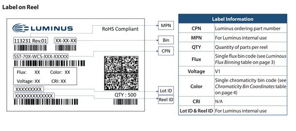 All Luminus LED products are packaged in an ESD bag and labeled on the package and reel with part numbers. In figure 1 below, shows what each of the items on the reel label means.