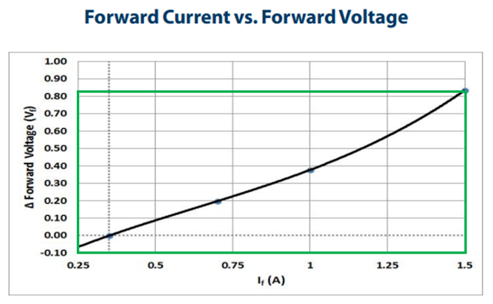 The typical voltage at If_max can be calculated by adding the ΔVf from the plot below to the typical Vf given in the characteristics table and is 2.10 V + 0.82 V = 2.92 V. In some cases, the current voltage plot may show Vf vs If, allowing Vf_max to be read directly.
