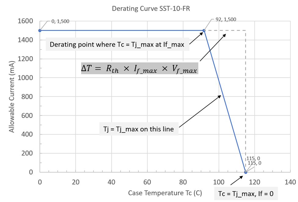 The SST-10-FR datasheet maximum junction temperature is 115°C, so the maximum allowed case temperature without current derating (Tc_derating) is 115°C – 23.21°C = 91.79°C. See plot below for a graphical interpretation of finding this point.