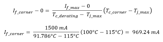An example of this type of derating curve is shown below by changing the rated case temperature to 100°C. A third point (Tc_corner, If_corner) needed for this plot which can be calculated from the two-point equation of a line and using Tc_corner as the input variable (100°C). The two points are (Tc_derating, If_derating) and (Tc = Tj_max, If = 0).