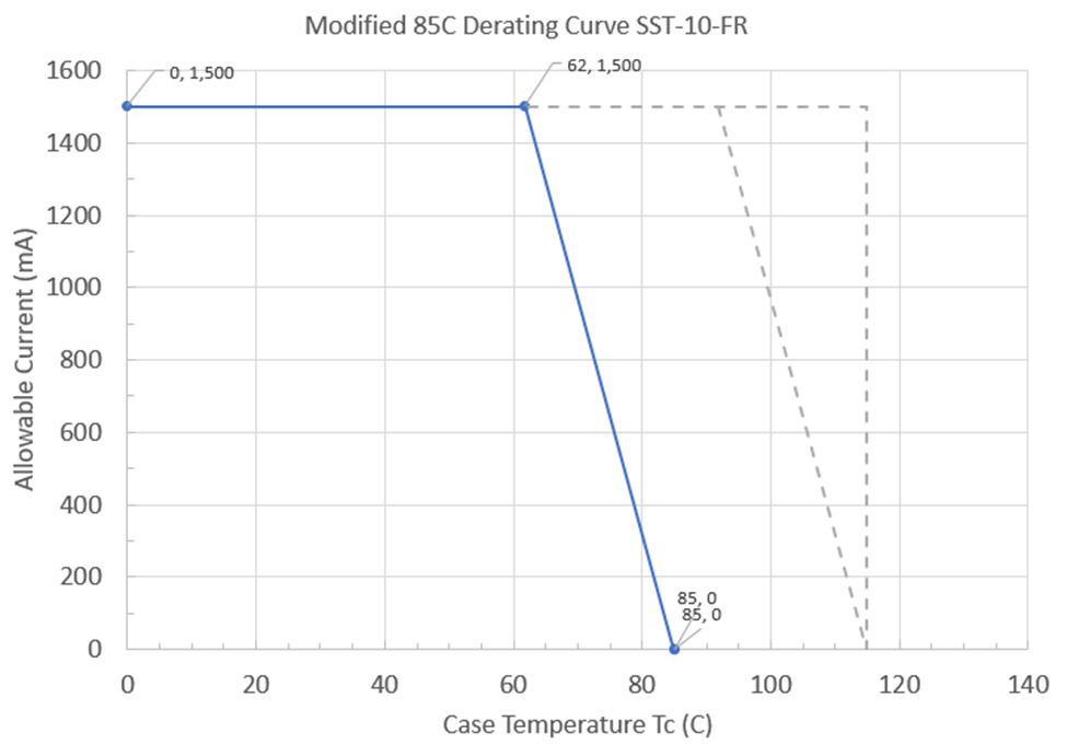 A system designer now knows that to use the full rated current for the SST-10-FR with a targeted junction temperature less than 85°C, the thermal system needs to be designed to accomplish a case temperature below 62°C. This format also indicates how much current derating is needed for higher case temperatures.