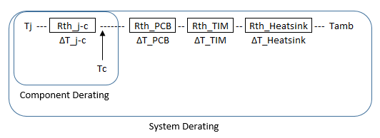 There is another type of derating curve in the literature where ambient temperature is the independent variable. This system level derating curve includes the thermal properties of the system heatsink and other components in the thermal path to ambient but is otherwise calculated in a similar way. The thermal resistance used in system level derating curves is the sum of the LED thermal resistance and the total thermal resistance of the heat extraction system. Since the thermal resistance of the heat extraction system can be designed to have nearly any value this article focuses on the LED component derating curve. The figure below shows the thermal circuits for component and system level derating.